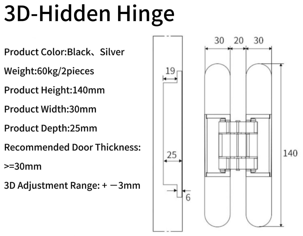 3D-hidden hinge3D Adjustable Concealed Door HingeModel No:3D-hidden hingeMain Size: 140*30*25mmMaterial:Zinc alloySpecifications: Black、Silver